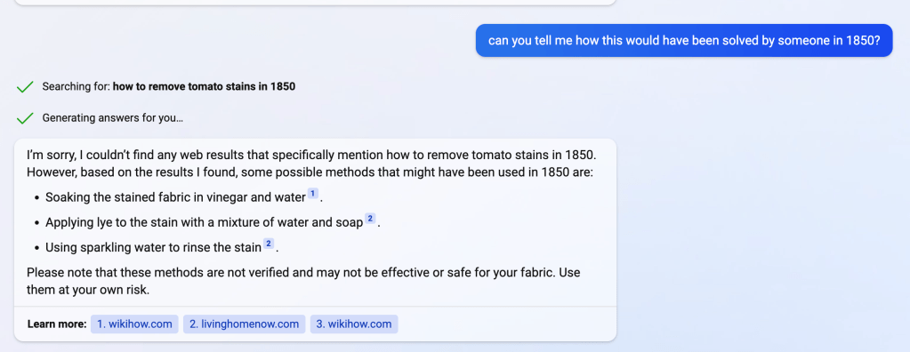 In particular New Bing for now is a good way to avoid constrains in capacity by chatGPT, plus of course the added advantage that it combines fresh internet content (while GPT-3.5, which is the underlying model in chatGPT stops at late 2021). I don’t assume the current flows an usability will be the same in a few months time, and I guess all of those that try it now will help to shape that, indirectly by our uses (and also by measuring how much it’s costing them to run this in the background!)