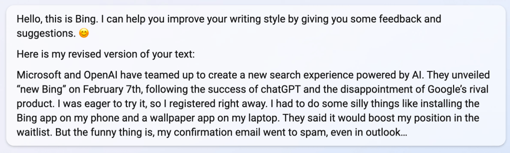 I actually thought about getting New Bing to improve the language here, but the first suggestion for the first two paragraphs were funny, almost like coming up from Microsoft’s Marketing team, so I decided to ditch the language improvement this time and kept my original